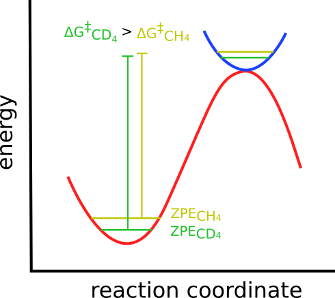 The reactant ZPE is usually more affected than the TS, since it is more strongly bound, and the changes in the \(\Delta G^{\ddagger}\) are uneven.