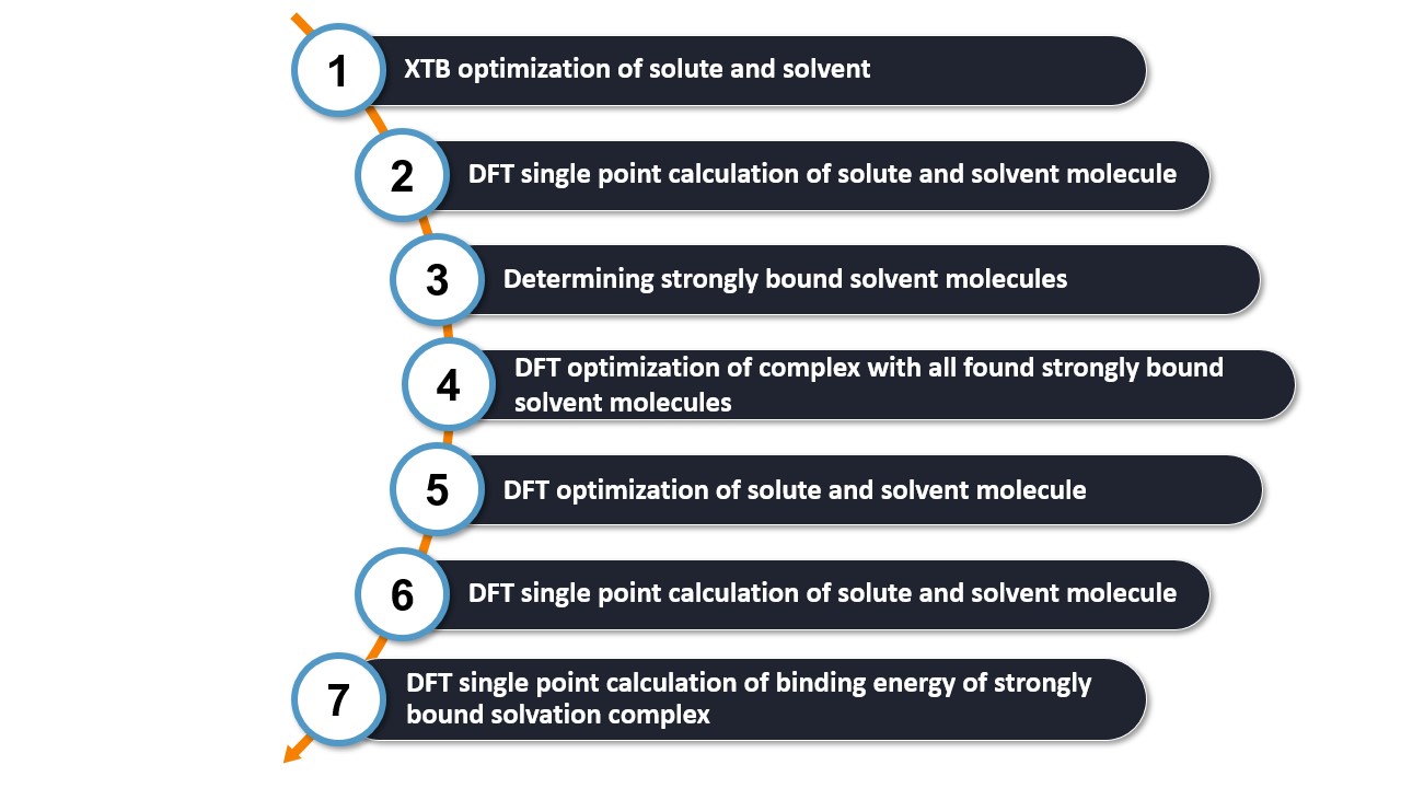 First, the solute and solvent structures are optimized at the XTB level. These optimized structures serve as the basis for the solvation model.