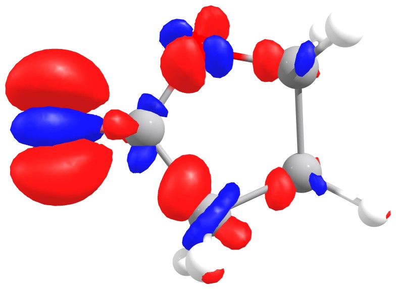 Fukui f+ function of butyrolactone. The red isosurface shows positive