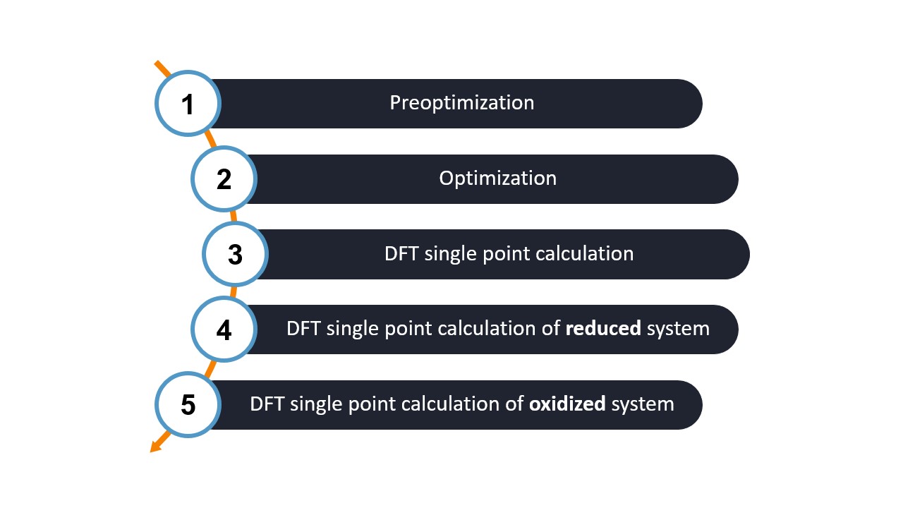 Step 4 and Step 5: SP DFT calculations of the reduced and oxidized systems - The single point DFT calculation is repeated for the reduced and oxidized systems to obtain their specific electron densities.